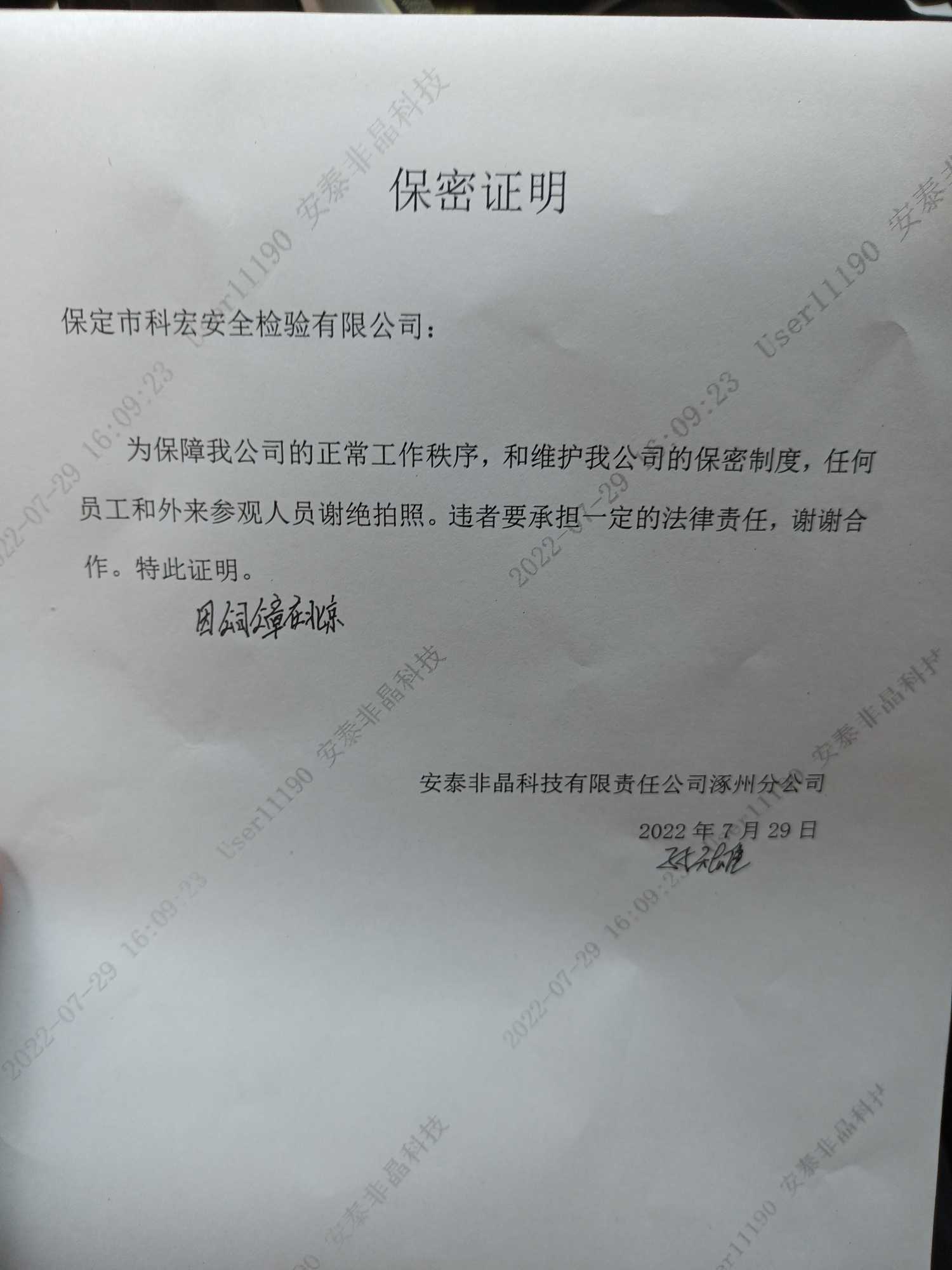 现场调查人员 | 毛国华 | 用人单位陪同人 | 孙天雄 | 时间 | 2022-07-29 |
