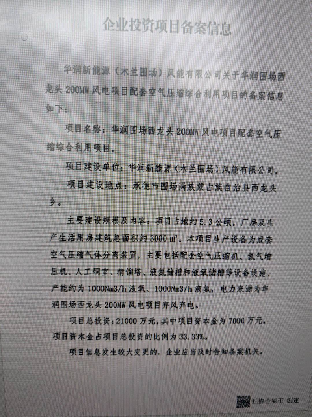 项目名称 | 华润新能源(木兰围场)风能有限公司华润围场绿 色气体分离示范项目 | ||||